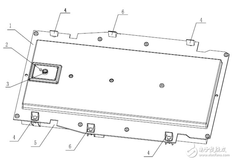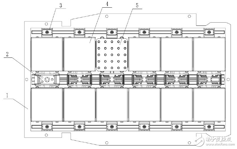 1.电池箱下盖 2.电源总线和通讯线插座 3.压紧机构 4.标准化电池模块 5. 滚动导向机构