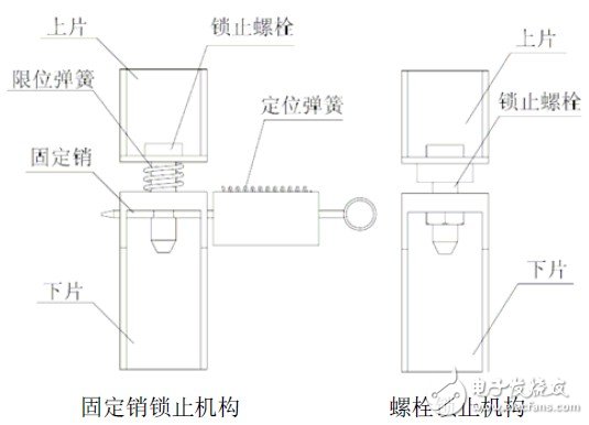 螺栓销锁止机构由上片、下片和锁止螺栓组成,上片和下片分别与车辆底盘和电池箱焊接,实现电池箱与车体的连接固定,通过锁止螺栓和螺母的配合实现锁止功能。