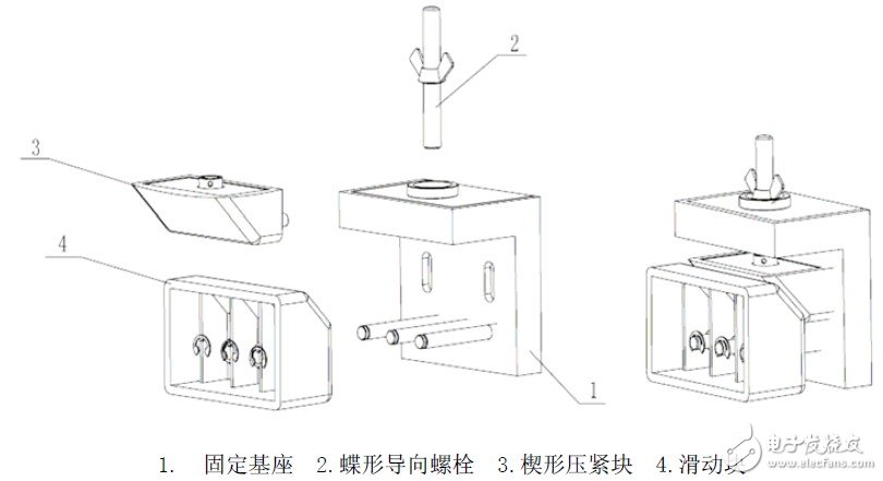 在电池框内部有压紧机构(图2、图4所示),用于标准化电池模块在电池箱内部的固定。压紧机构由固定基座、蝶形导向螺栓、楔形压紧块和滑动块组成。通过蝶形导向螺栓与固定基座的相对位移,带动楔形压紧块的上下运动,挤压滑动块沿着固定基座的导轨左左右滑动,从而挤压标准化电池模块相对电池箱内壁的移动,实现标准化电池模块的固定。