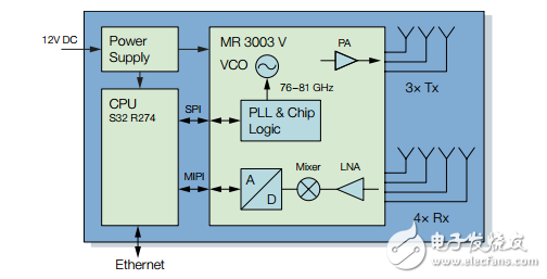 MR3003套件拥有3个发射天线通道,4个接收天线通道,采用PLL锁相环控制,内置的线性调频脉冲发生器允许操作非常高速的频率扫描,相比24GHz频段,77GHz套件具有更大的调制带宽为客户提供了更高的分辨率。信号经过高速FFT计算处理后,MR3003套件可以通过以太网接口输出目标信号的数字信息。