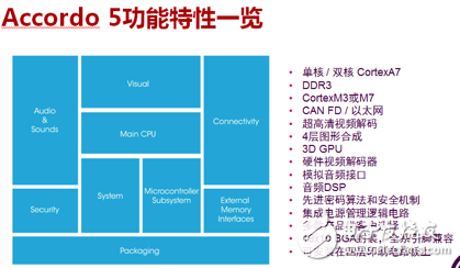 图形和音视频功能是Accordo 5 最突出的功能,虽然主打中档汽车市场,但是500MHz 3D图形处理器内核使其图形处理性能远超同级产品。系统架构支持1080p分辨率的2D和3D图形,常用格式包括OpenVG、OpenGLES-2.0,具有图形效果功能。高性能音频DSP、六个立体声模拟声道和支持多个工业标准的音频接口,内置显示控制器支持全高清分辨率的TFT-LCD触屏。