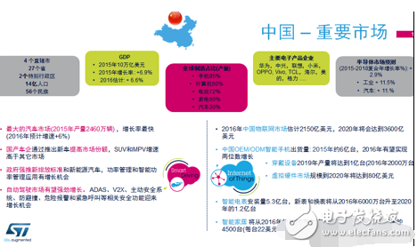 据意法半导体大中华及南亚区、韩国区汽车产品和分立器件部汽车市场应用高级总监Edoardo MERLI 透露,目前公司的重点在有两大领域:一个是IoT方向,产品涉及到的行业非常广泛,包括智能工程、智能城市、智能家居以及现在非常流行的智能硬件。