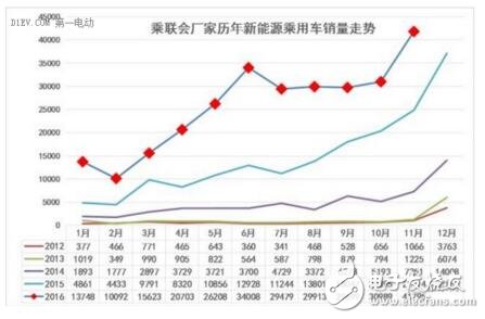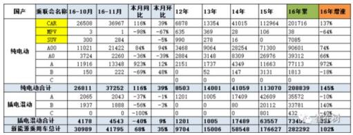 在2015年新能源车高增长后,2016年新能源乘用车市场呈现调整规范发展的特征。上半年的3-6月新能源车逐步实现恢复性增长,6月冲刺到3.5万台水平。下半年的7-10月新能源车处于3万台左右的位稳定状态调整整固,等待进一步的增长动力。11月的政策支持新能源的力度有所改善,11月新能源乘用车销量达到4.2万的新高。