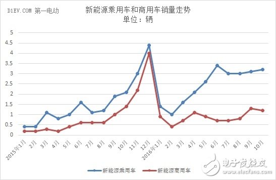 累计方面,2016年1-10月新能源汽车生产35.5万辆,销售33.7万辆,比上年同期分别增长77.9%和82.2%。其中纯电动汽车产销分别完成27.6万辆和25.8万辆,比上年同期分别增长98.1%和102.5%;插电式混合动力汽车产销均完成7.9万辆,比上年同期分别增长31.0%和37.2%。占比方面,纯电动乘用车依旧是市场主力,占比52%;插电式乘用车销量受制于10月的大幅下滑,今年1-10月累计销量占比仅为20%,不及纯电动商用车的市场份额(25%)。