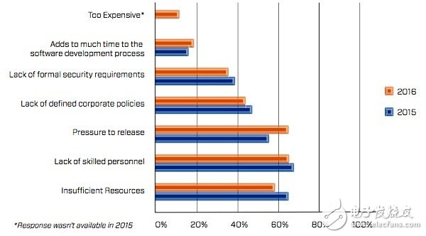 在被问到保障车用软件安全面临的主要挑战有哪些时,受访依据严重程度所列出的包括:缺乏技术人员(65%)、推行压力(65%)、资源不足(58%)、缺乏明确的企业应用程序安全策略(43%)、缺乏正式的安全需求(34%)、时间限制(18%),以及支出(11%)。以上结果与2015年度的结果类似,只有因为推行压力一项,由去年度的54%大幅增加。