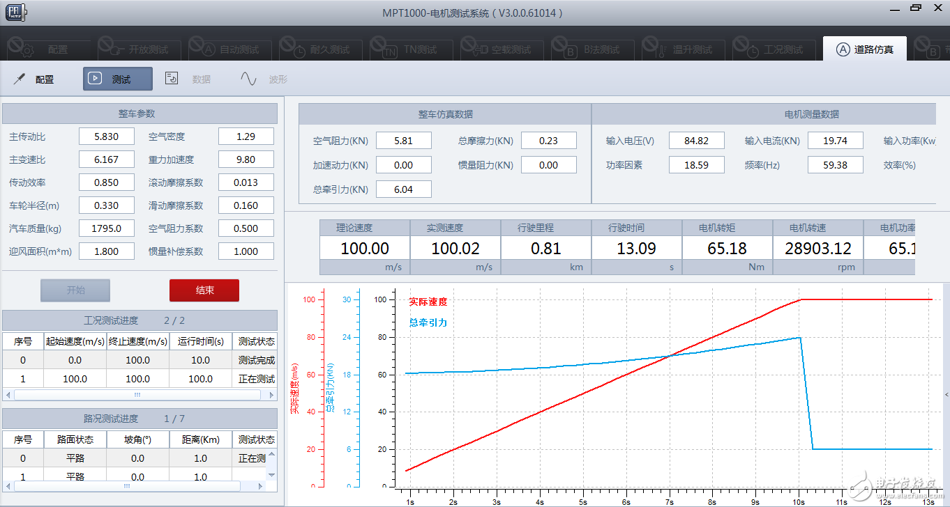 在获得工况数据后,应用MPT电机测试平台中的道路仿真试验模块,在速度模式下运行,转速指令按照工况数据设置,当扭矩模式下,扭矩指令同样按照工况数据设置。在相应的时间点施加对应的负载电机转速以及被测电机扭矩,MPT1000自动完成对被测电机及驱动器的工况试验。同时MPT同步记录被测电机的电压、电流、功率,温度等基本参数以及波形曲线,并且实时运算出瞬时效率,以及选取区间的平均效率。
