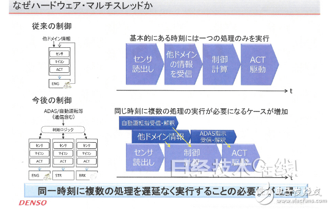 此前只需要配合人的操作,串行处理也来得及(上),到了ADAS·自动驾驶时代,要配合进行整体控制的CPU,因此需要微秒级的响应速度,需要并行处理(下)。电装的幻灯片
