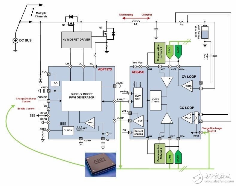 精密模拟前端和控制器AD8450/1利用内部差动放大器PGDA测量电池电压,并利用内部仪表放大器PGIA和外部分流电阻(RS)测量电池上的电流。然后,它通过内部误差放大器和外部补偿网络(用于确定环路功能是CC还是CV),将该电流和电压与DAC设定点相比较。在该模块之后,误差放大器的输出进入PWM控制器ADP1972,以确定MOSFET功率级的占空比。最后是构成完整环路的电感和电容。本部分的说明针对充电和放电两个功能,因为ADP1972是降压和升压PWM控制器。