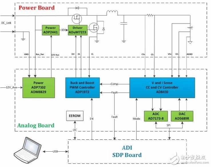 上图包含两种功能:一是对电池充电,二是对电池放电,这由AD8450/1和ADP1972的模式信号决定。每个功能有两种模式:恒流(CC)模式和恒压(CV)模式。两个DAC通道控制CC和CV设定点。CC设定点决定充电和放电两个功能的CC模式下环路中有多少电流。CV设定点决定环路从CC进入 CV时的电池电位,同样适用于充电和放电两个功能。