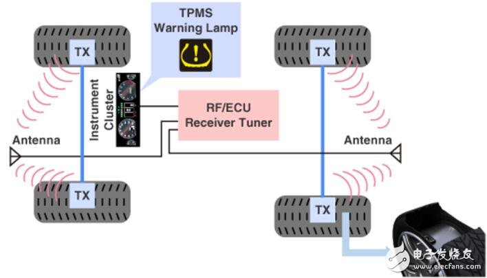 轮胎压力监测系统(Tire Pressure Monitoring System,TPMS),是一种采用无线传输技术,利用固定于汽车轮胎内的高灵敏度微型无线传感装置在行车或静止的状态下采集汽车轮胎压力、温度等数据,并将数据传送到驾驶室内的主机中,以数字化的形式实时显示汽车轮胎压力和温度等相关数据,并在轮胎出现异常时(预防爆胎)以蜂鸣或语音等形式提醒驾驶者进行预警的汽车主动安全系统。从而确保轮胎的压力和温度维持在标准范围内,起到减少爆胎、毁胎的概率,降低油耗和车辆部件的损坏。