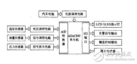 本系统功能由硬件和软件两大部份协调完成。硬件部分主要完成各种传感器信号的采集、转换以及各种数据信息的显示等;软件主要完成信号的处理及控制功能等。系统功能框图如图1所示。ADμC845单片机获取各个传感器的输出信号,经自身模数转换器转换。转换后的数据由LCD液晶屏及LED指示灯显示输出,当部分数据达到或超过设定的峰值时。输出告警信号。
