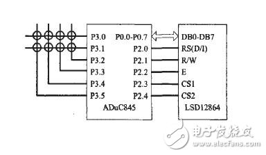 键盘控制电路由ADμC845的P3.0~P3.5构成。其接法如图2所示。该键盘有2行4列共8个键。使用6个I/0作为控制线。其中采用P3.0、P3.1作为行扫描线,采用P3.2。P3.5作为列回复线来构成矩阵键盘。在运行中。为防止按键的连击和抖动,当有键按下时。程序并不立即进入按键处理程序。只有在按键按下又松开的时刻才进入程序处理。