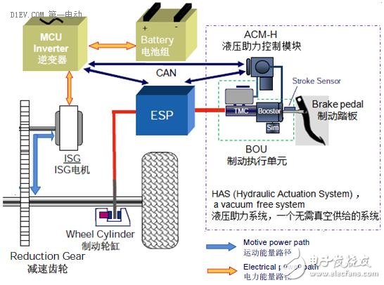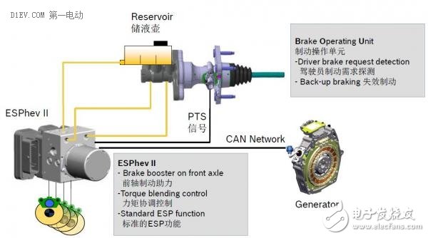 以Bosch公司的ESPhev为例,该系统无需真空助力器和EVP,主要基于原有的ESP技术,ESP除了标准功能外,增加了常规的制动液压助力功能和回馈力矩协调功能。ESP根据BOU(Brake Operating Unit, 制动操作单元)里的PTS信号计算驾驶员的制动需求,再根据电机所能提供的回馈制动力大小,以及综合车辆稳定性,进行制动力的分配,液压制动系统压力由ESP提供。