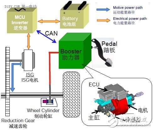 该系统的有优点是原制动系统的零部件大都可以沿用,实施方便,技术成熟,系统稳定,造价较低。缺点主要是电机回馈制动力直接叠加在原有摩擦制动力之上,不调节原有摩擦制动力,能量回收率低,制动舒适性差。制动舒适性差不仅是表现在电机回馈制动和摩擦制动的耦合与切换产生的冲击、平顺性差,还表现在高原地区,由于气压低,EVP无法提供和在平原地区一样高的真空度,真空助力器的助力差,踏板力会变大。