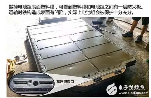 电池组表面不仅有塑料膜保护着,而且塑料膜下面还有防火材料的护板。护板下面才是电池组。护板通过螺栓与电池组框架连接,并且连接处充满了密封粘合剂。外观来看电池组保护的不错。