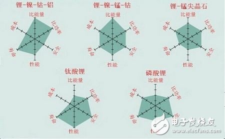 图1比较了5种电池在安全性、比能量(也称为容量)、比功率(电池的大倍率充放电的能力)、电池的高低温性能、寿命(包括使用寿命和储存寿命)以及成本 6个指标的性能。但图中没有提及充电时间,如果有合适的电源插座可用,电动汽车动力系统的所有电池都可以快速充电,超快速充电是个例外情况,不过大多数用户还是能够接受几个小时的充电时间的。图1 也没有列出自放电性能——这是另一个需要重视的电池特性,在一般情况下,锂电池自放电速率较低,如果电池是新的,自放电几乎可以忽略不计。然而,因受热引起的电池的老化会加速电池的自放电并引起电池管理上的问题。在电动汽车可选的电池类型中,磷酸锂电池比其他电池系统自放电速率都高。