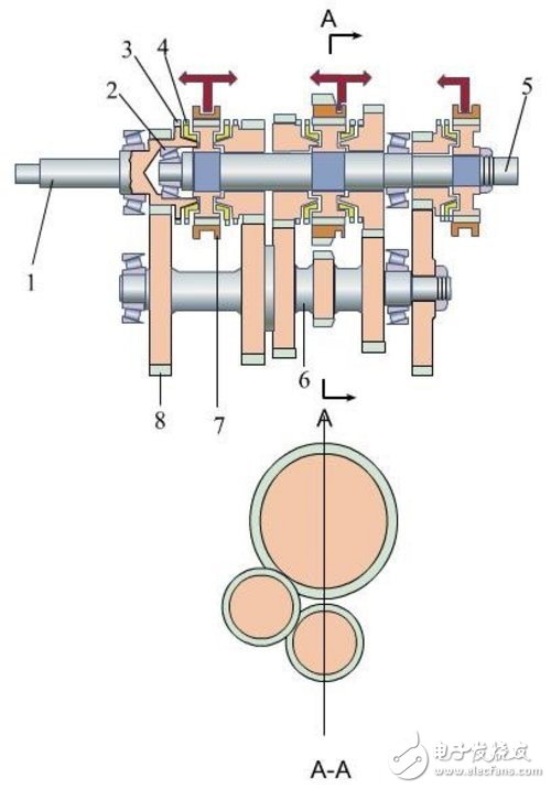 1-输入轴 2-轴承 3-接合齿圈 4-同步环 5-输出轴 6-中间轴 7-接合套 8-中间轴常啮合齿轮