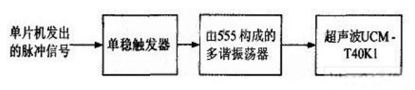 超声波发射硬件电路框图如图2所示,单稳触发器接收来自押S430F1101的P1.3端口输出的40ms触发器的电压提升和脉宽控制输出频率不变、高电平宽度为160us的方波,方波周期为40m s。此脉冲信号作为555振荡器的置位脉冲。在置位期问,555定时产生40的振荡信号,由超声波发射头T40K 1将电信号转化成超声波发射出去。超声发射器便发射出脉冲数为7个的脉冲串(1/40kHz=O.25ms),超声波发射器的声波传物,再由反射物反射到接收器,传播距离为2倍测量距离,由式(1)可知。