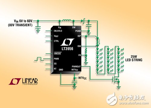 LT3956 在 LED 串的高压侧检测输出电流 (常称为高压侧电流检测)。这是最灵活的 LED 驱动方法,可实现升压、降压或降压-升压模式配置。