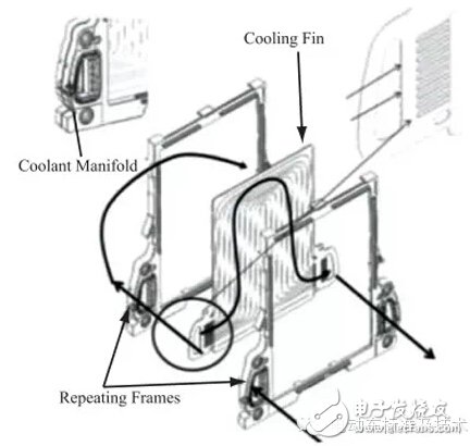 通用汽车公司的Volt插电式混合动力汽车使用了288节45 Ah的层叠式锂离子电池。电池组的电气连接可等效为96片单体串联成组,3组并联。热管理系统采用了液冷式设计方案,以50%水与50%乙二醇混合物为冷却介质。单体电池间间隔布置了金属散热片(厚度为1 mm),散热片上刻有流道槽。冷却液可在流道槽内流动带走热量。在低温环境下,加热线圈可以加热冷却液使电池升温。