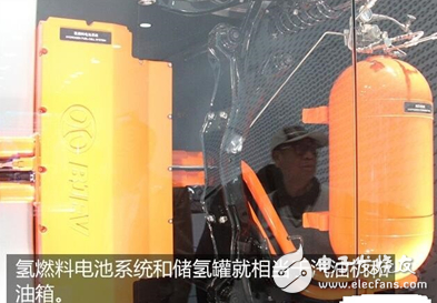 这个结构是这样的,最前方是电机,中间底盘下面是电池,这个和传统电动车没什么区别。而后面多了一个氢燃料电池系统以及一个储氢罐。