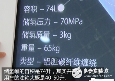 通过向现场工作人员询问,储氢罐是74升,大概可以提供额外300公里续航,而电池可以提供200公里续航,累计有500公里续航。这比一般的家用车邮箱要更大,而且由于汽油的油箱是扁平的铺在汽车底部,不会侵占后备箱,而储氢罐则肯定会侵占后备箱。
