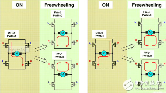 电机通常采用PWM技术控制转速和转矩。此外,如果电机旋转方向在实际应用中必须变化,则必须改变电机两个端子上的电源电压。基于这些需求,采用四个开关按照要求将电源电压连到电机的两个接线端子上的H-桥是典型的双向直流电机控制解决方案。
