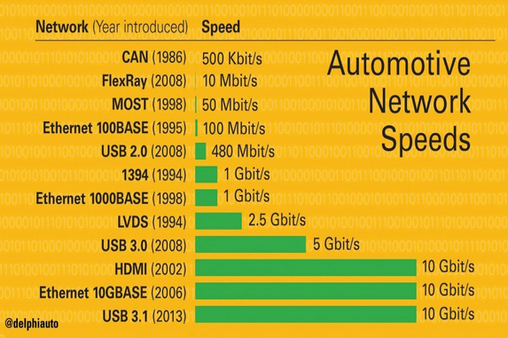 支撑起自动驾驶的数据量、运算量都是巨大的,而这些芯片,都要在一张 CAN 总线的网络上去部署(特斯拉使用的以太网和它们相比太超前了),它的问题在于:这个网本身就慢。到底有多慢?可以看下面这张图: