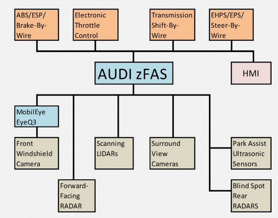 如果你这两年比较关注汽车电子,应该知道奥迪展出过名为“zFAS”的自动驾驶控制模块,这其实就可以理解为德尔福那个多域控制器的“奥迪定制版”。奥迪先后展示过两个版本的 zFAS,第二版比第一版更精简,集成度更高。