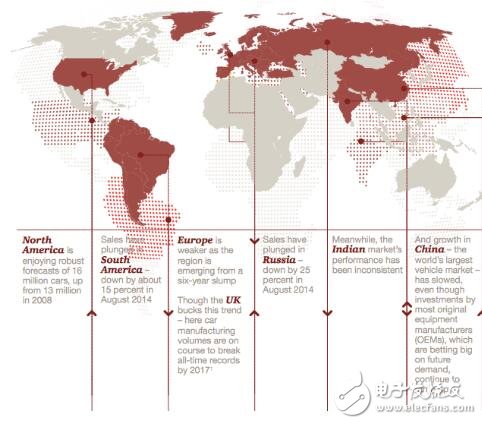 根据PWC 的全球调查,目前汽车产业全球市场分布不均,诸如北美、欧洲、印度、中国、南美、俄国等几个指标市场的销售量状况不一。对于汽车产业而言,该产业正被三股势力推进改变的动??能: