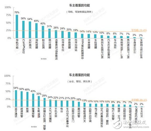 通过2015年度杭研的基础研究项目,我们发现,对于中高级车主,导航在所有功能中的重要性占比最高(76%),远远高于其他功能。此外,汽车GPS定位(56%)、实时路况(54%)、油耗提醒(49%)、胎压监测(40%)在导航和数据监测类中占比也较高。而在安全、智控、娱乐类功能中,蓝牙通话(54%)、超速报警(50%)、救援(48%)、碰撞报警(43%)、车载wifi(35%)较受重视。相反,之前在互联网领域呼声较高的“车主社交”“车联网云端服务”对于车主来说,可能并没有那么重要。