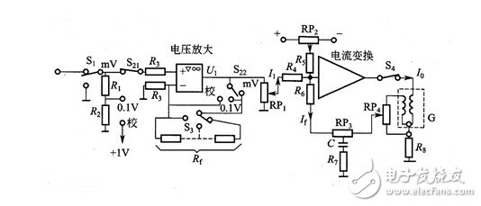 图3所示出的是利用这种原理制成的LM-12型记录仪线路图。它由前级电压放大、后级电流变换和虚线框内的表头三个部分组成。电压放大级由集成运放构成,用来将被测信号Uin,放大(或衰减)变换为U1。电流变换级是具有深度电流负反馈的直流放大器,用来将电压U1转换为输出电流Io。