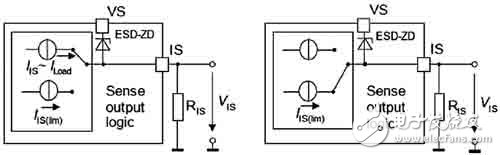 BTS7960的引脚IS具有电流检测功能。正常模式下,从IS引脚流出的电流与流经高边MOS管的电流成正比,若RIS=1kΩ,则V IS=I load/8.5;在故障条件下,从IS引脚流出的电流等于I IS(lim) (约4.5mA),最后的效果是IS为高电平。如图4所示,图(a)为正常模式下IS引脚电流输出,图(b)为故障条件下IS引脚上的电流输出。