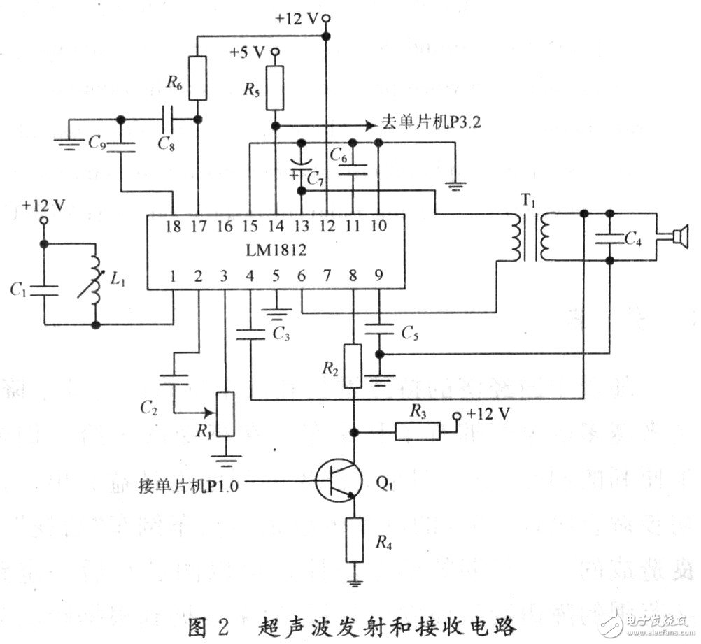 本系统采用超声波专用集成电路LM1812作为超声波发射和接收电路的主控芯片。LM1812是一种通用型超声波收发器,主要用在各种各样的测距、定向和通信中。芯片包括一个脉冲调制C类发射器,一个高增益接收器,一个脉冲调制检测器及噪音抑制电路。LM1812第1脚外接L1,C1决定了电路发送或接收的工作频率,其工作频率为: