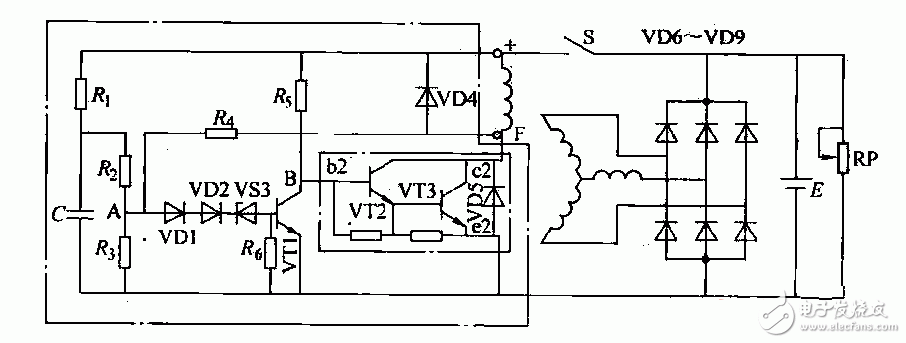 3)发电机电压低于规定值时,VS3叉截止.VT1截止,从而VT2、VT3导通,励磁电流又被接通,发电机电压又重新升高。如此反复,使发电机电压稳定在规定值范围内。