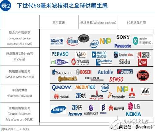 能跨越车规门槛之供应商才可望进入此新蓝海市场,如表2所示为下世代5G/毫米波技术之全球供应生态系。