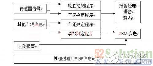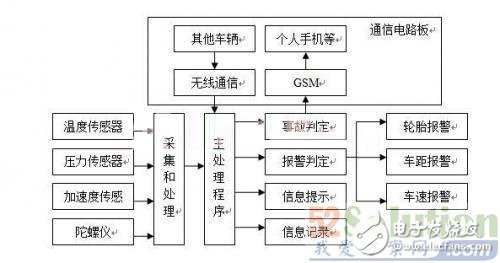 传感器采集汽车四个轮胎以及车内外的大气的温度和压力;加速度传感器根据安装位置和方向不同可测出汽车直线行驶加速度和垂直加速度,得到汽车行驶和路面状况;陀螺仪可测出路面的坡度和车辆转弯的角度等。主处理和判定模块是对当前自身车辆行驶信息和其他车辆信息进行分析,并作出判定,根据判定结果作出相应的报警和界面提示显示等。系统可对采集和处理的数据进行存储,并可以传输给上位机。上位机软件可以根据这些信息完全模拟出车辆之前的行驶路径过程等,为事故分析等。