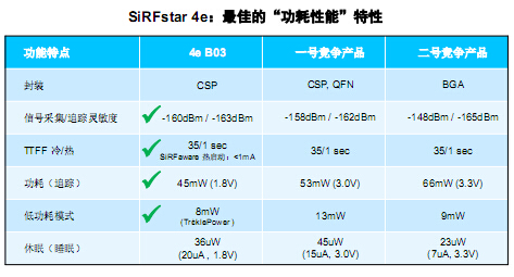 在这一背景下,CSR推出了新一代的定位芯片SiRFstar 4e B03和SiRFstar 5e B02。据CSR公司定位产品事业部高级总监Dave Borison的介绍,SiRFstar 4e B03拥有着更高的性能、更低的功耗和更小的尺寸。SiRFstar 4e B03的信号采集灵敏度达-160dBm,追踪灵敏度达-163dBm;它的InstantFix扩展星历(SGEE、CGEE);并通过芯片内部的先进的DSP架构主动消除干扰。在功耗方面,SiRFaware Hot-Start:1s TTFF、功耗低于1mW;TricklePowerTM 模式下的功能是8mW/1Hz。尺寸仅为3.5mm x 3.2mm x 0.6mm,采用42-WLCSP封装,0.5mm球间距。