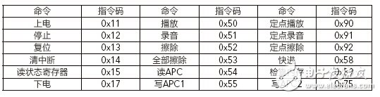SPI模式下,ISD1730相关命令如表1所示。注意芯片管脚2连接一只蓝色LED,用以指示语音芯片工作状态,为使能此LED,所有的指令码bit4必须置1。