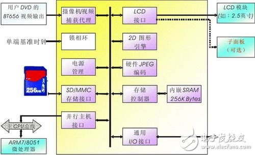 当配置好256KB内建的存储器中的帧缓冲器,DVD图像就会显示在LCD屏上。这款图像处理器最大可支持640X480三角形排列(200KB)和480xRGBx272条纹的排列(255KB)。颜色深度可以支持到1,2,4,5,16和32位。