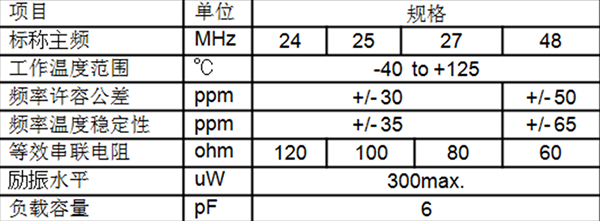 XRCGB-F-A系列的产品外观图如图1所示,代表特性如表1所示。频率对应的是24MHz到48MHz,采用了最合适的晶体元件的设计,将汽车的一般操作温度(-40~+125℃)中的频率许容偏差缩小到了最小的+/-35ppm,Ethernet®等 第二代车载LAN和影像处理IC中也能对应。此外,负荷AEC-Q200,也完全对应RoHS/ELV指令。