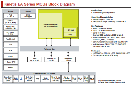 据飞思卡尔汽车电子微控制器亚太区产品经理李兴介绍,Kinetis EA系列是基于ARM的Cortex-M0+内核设计的32位MCU,拥有8k-128k闪存,-40/+125decC。