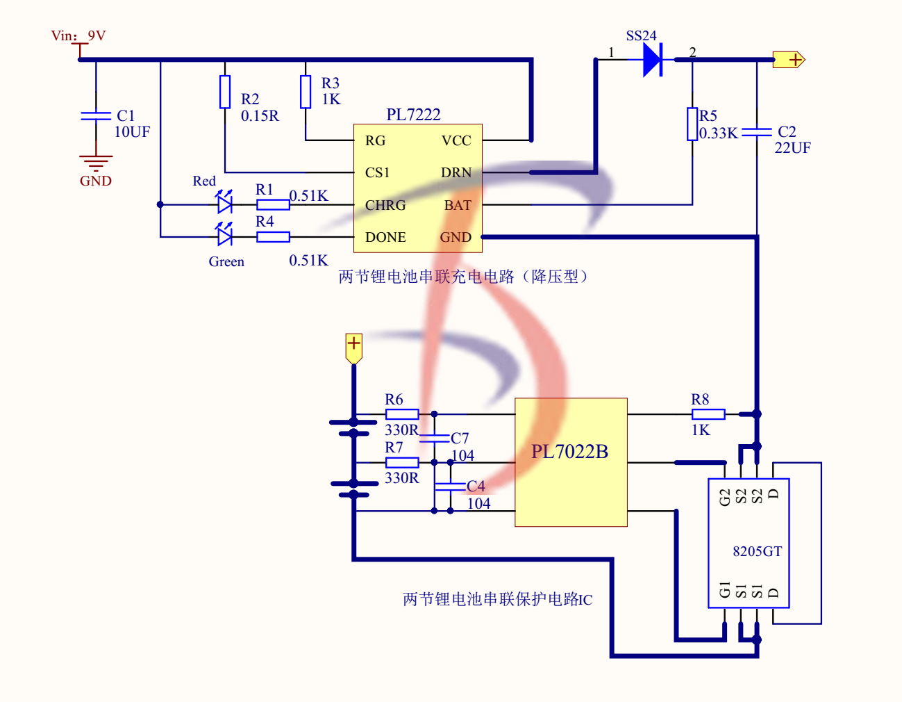 与PL7022B两节串联的锂电池保护芯片,组合电路如下: