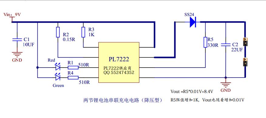 输出电压通过R4/R5设定:8.4V,对两节/双节锂电池进行充电。