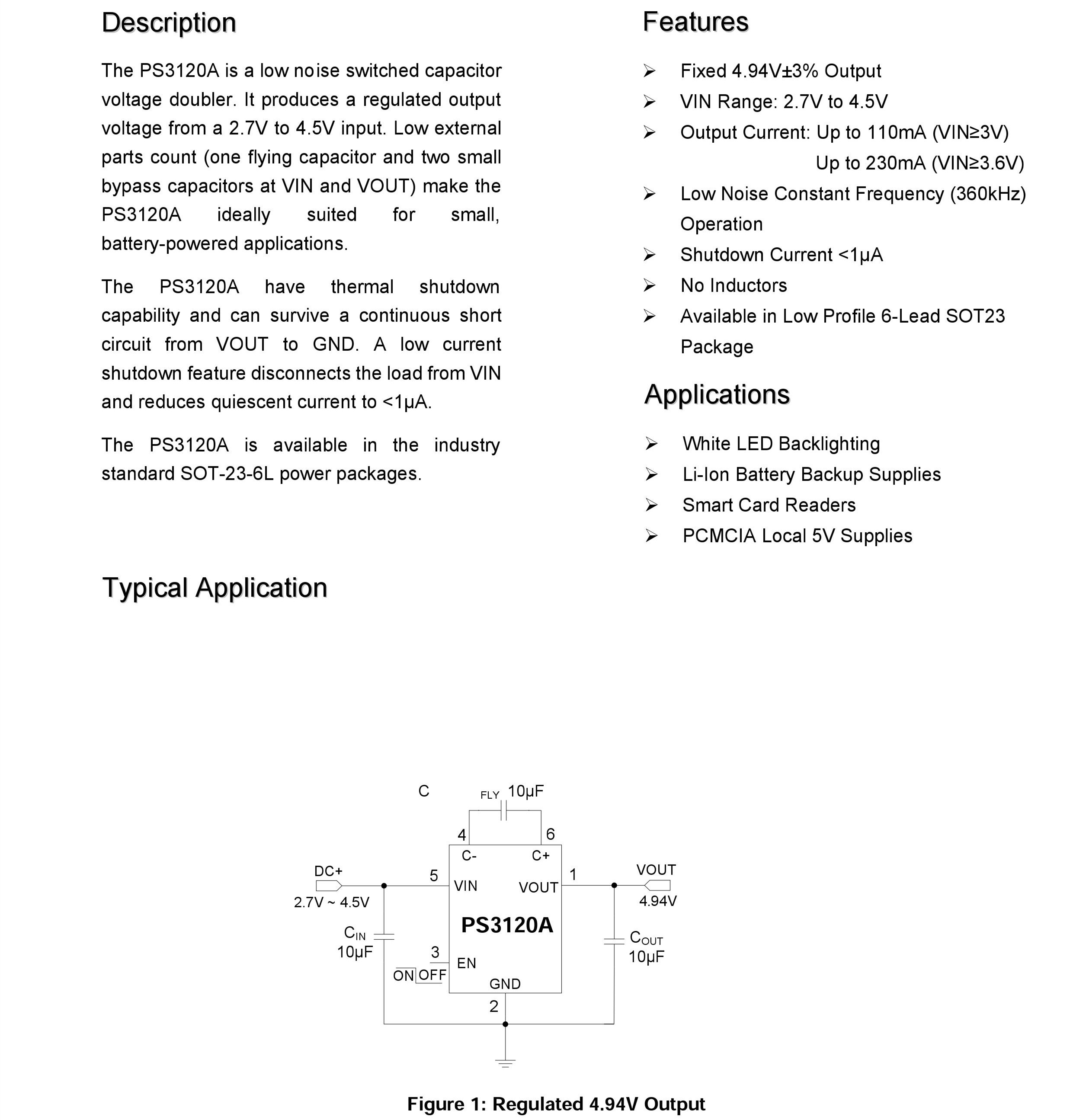 | 深圳市百盛新纪元半导体有限公司介绍: | PS3120A无电感升压IC(唯一的一个无电感升压IC) 输入电压:2.7V至4.5V 输出电压:4.94V 输出电流:230MA,输入电压大于等于3.6V时。 |