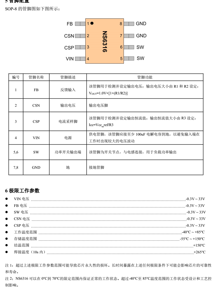 NS6316 是支持高电压输入的同步降压电源管理芯片, 在 4~30V 的宽输入电压范围内可实现 3A的连续电流输出。 通过调节 FB 端口的分压电阻,可以输出 1.8V 到 28V 的稳定电压。 NS6316 具有优秀的恒压/恒流(CC/C)特性。 NS6316 采用电流模式的环路控制原理, 实现了快速的动态响应。 NS6316工作开关频率为 130kHz, 具有良好的 EMI 特性。
