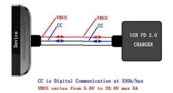 USB-PowerDelivery (USB PD看似只是电源传输与管理的协议,实际上它可改变端口角色,可与有源电缆通讯,允许成为受电设备等诸多高级功能,就是手机给另外一部手机的反向充电,这个知道就可以了。USB PD协议是通过 type C口独有的CC 引脚来进行通讯。