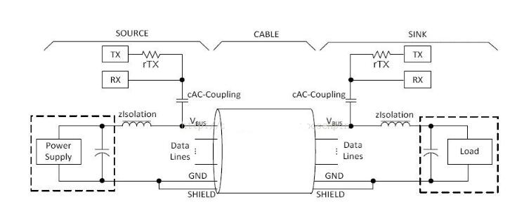 USBPD的通信是将协议层的消息调制成24MHZ的FSK信号并耦合到VBUS上或者从VBUS上获得FSK信号来实现手机和充电器通信的过程。如图所示,在USB PD通信中,是将24MHz的FSK通过cAC-Coupling耦合电容耦合到VBUS上的直流电平上的,而为了使24MHz的FSK不对PowerSupply或者USBHost的VBUS直流电压产生影响,在回路中同时添加了zIsolation电感组成的低通滤波器过滤掉FSK信号。