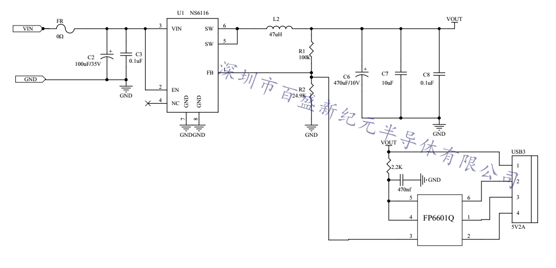 NS6116单口QC3.0快充车充充电器原理图,功能:支持QC3.0,QC2.0,华为FCP,三星AFC快充