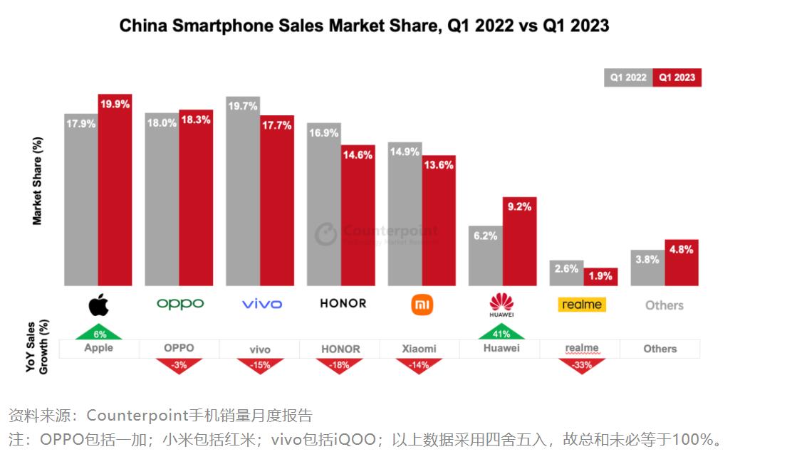 据权威市场调研机构Counterpointpoint公布的数据显示,中国市场上华为的手机销量Q1同比大涨41%,市场份额增加到了9.2%,华为也成了国内手机品牌中唯一一个逆势增长的品牌。分析师表示,中端Nova 10系列和高端Mate 50系列虽不支持5G,但备受用户青睐。华为表示,自3年多前被美国制裁后,其产品发布周期已恢复正常。